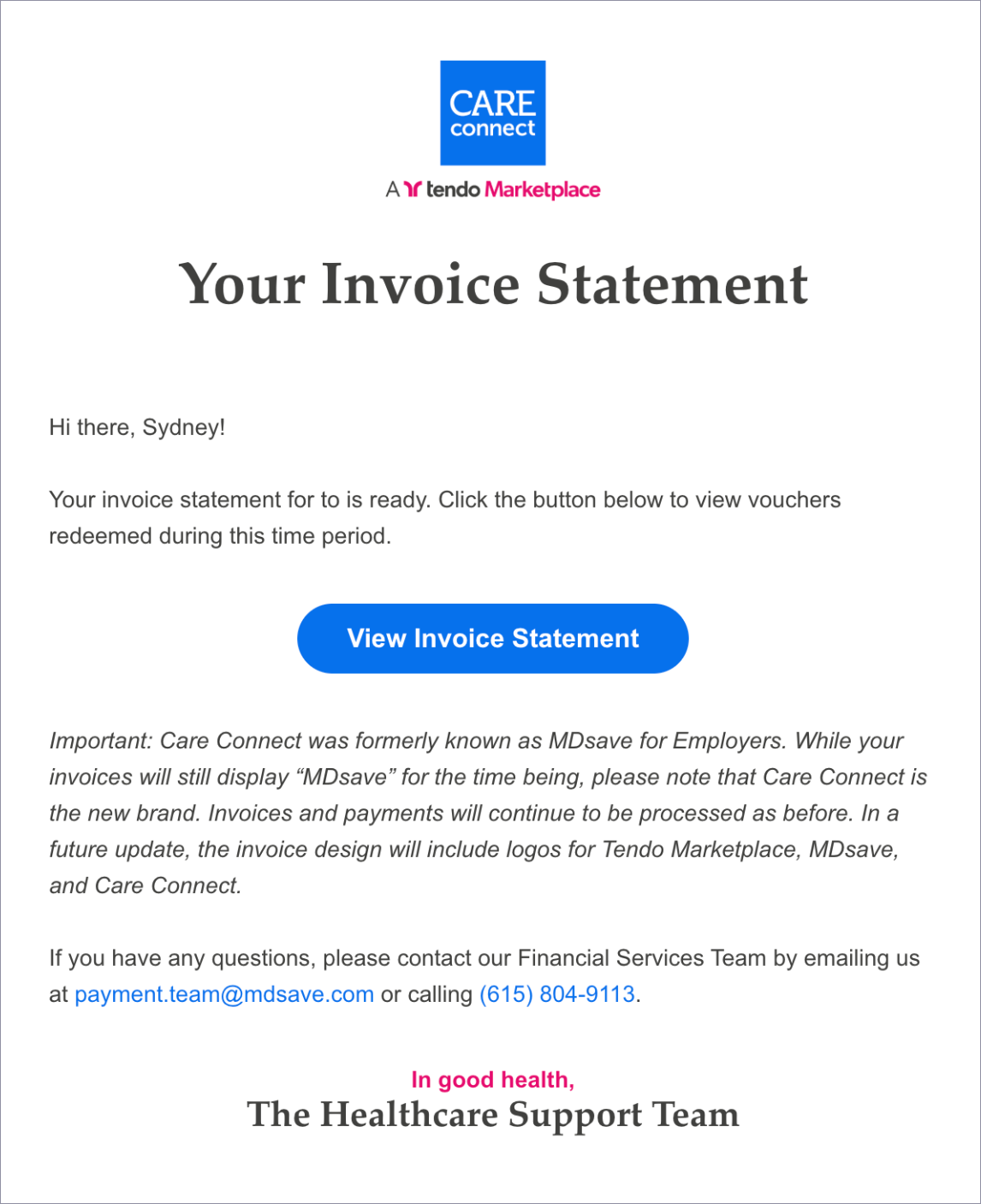 On the first day of each billing period, if your company has an invoice, your users who are set up to receive invoices will receive an email notification titled Your MDsave Invoice Statement is Available. The email will prompt the user to log in to view the invoice.