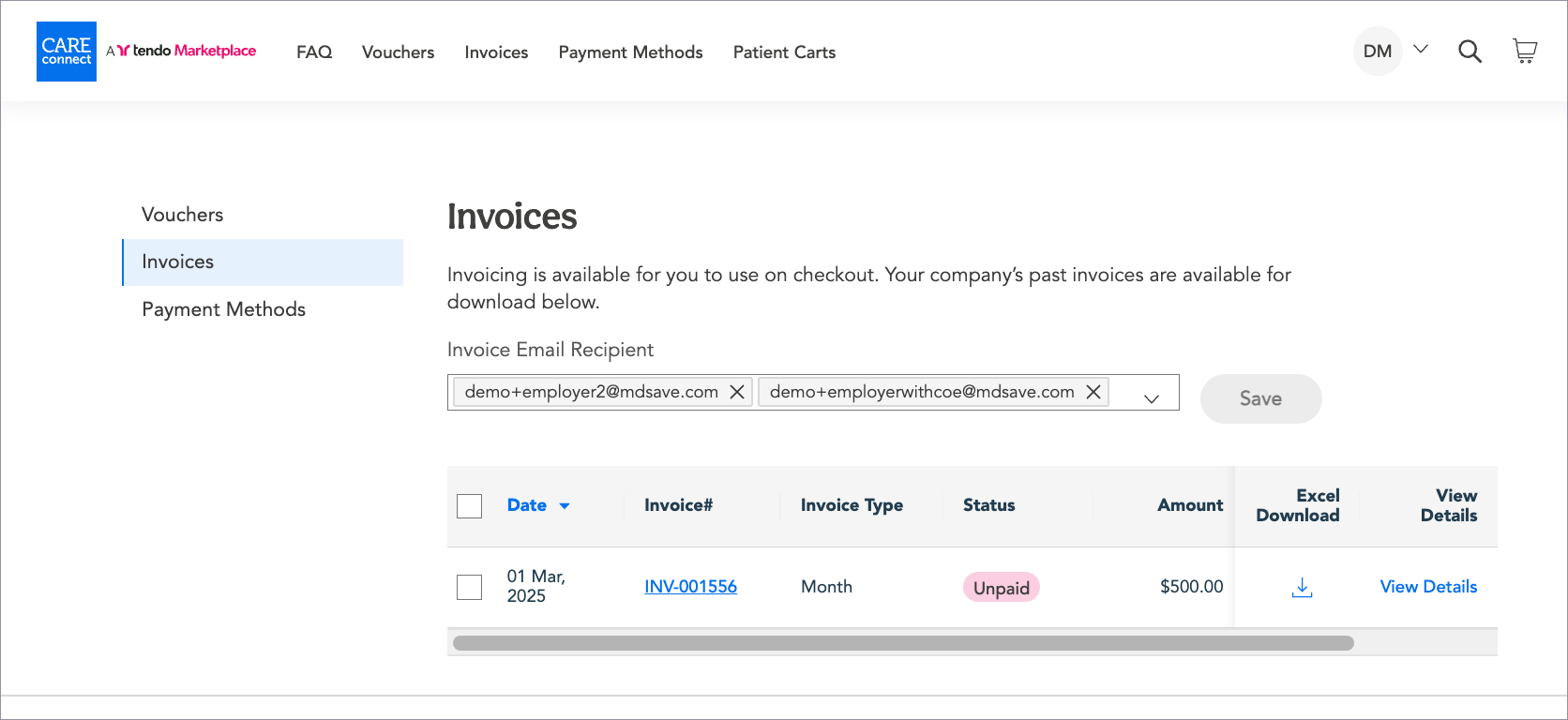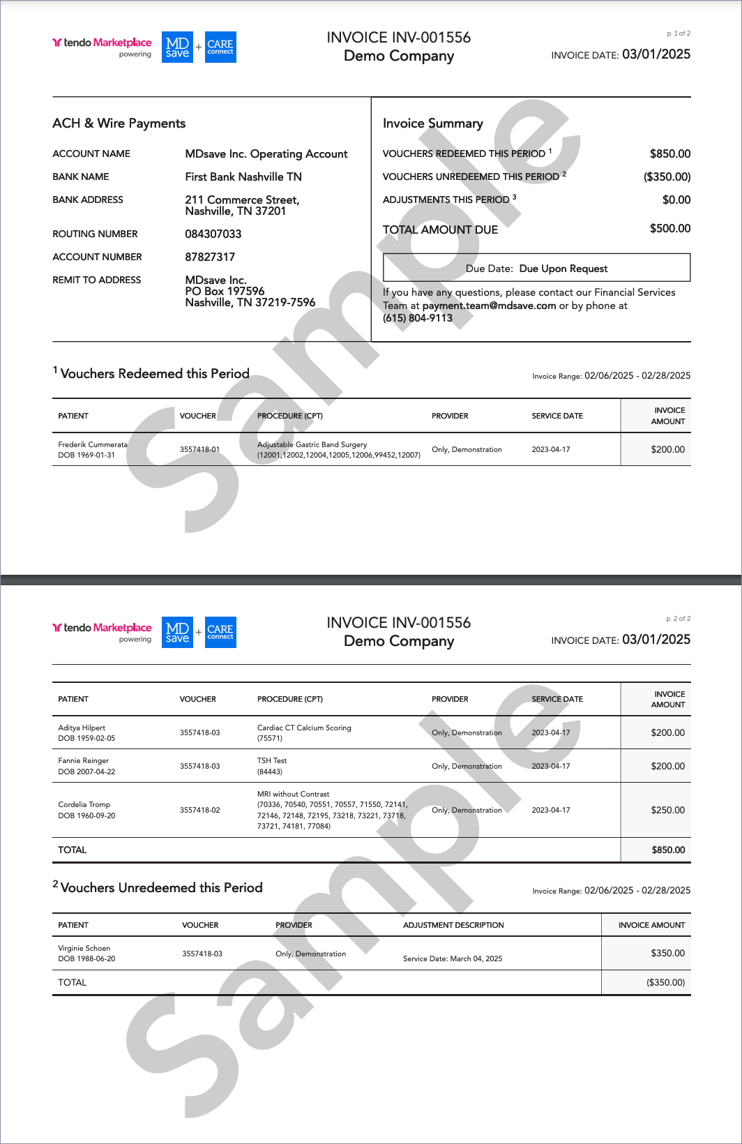 Invoices include any fund transfers to a company for vouchers purchased via invoice from MDsave that were redeemed during the previous month.