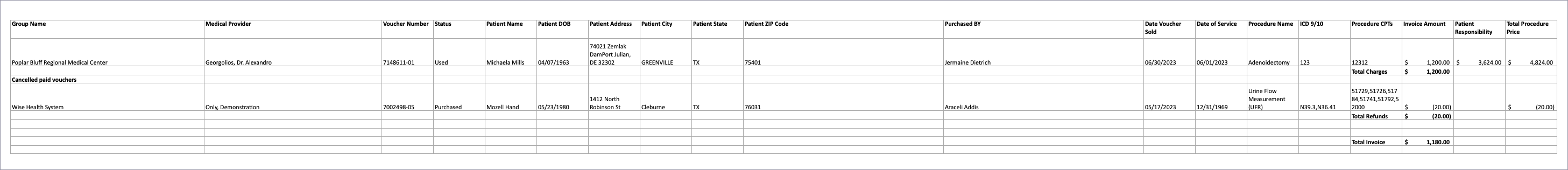 For vouchers purchased via Patient Responsibility Split Payment, we will show three columns for the price. Invoice Amount contains the amount being invoiced. Patient Responsibility contains the amount that was paid for that procedure by the patient. Total Procedure Price sums up the invoice amount and the patient responsibility.
