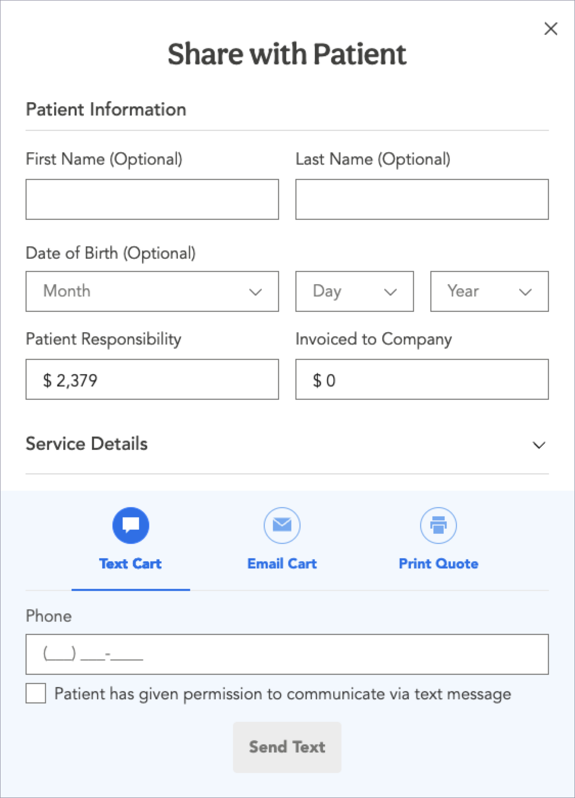 When this feature is enabled for your company, care navigators can access the Share with Patient popup below from the shopping cart and on Checkout and fill it out. They have the option to select Text Cart or Email Cart to send the shopping cart to the patient, and also can print a Quote to generate a PDF or printout that can be shared with the patient.