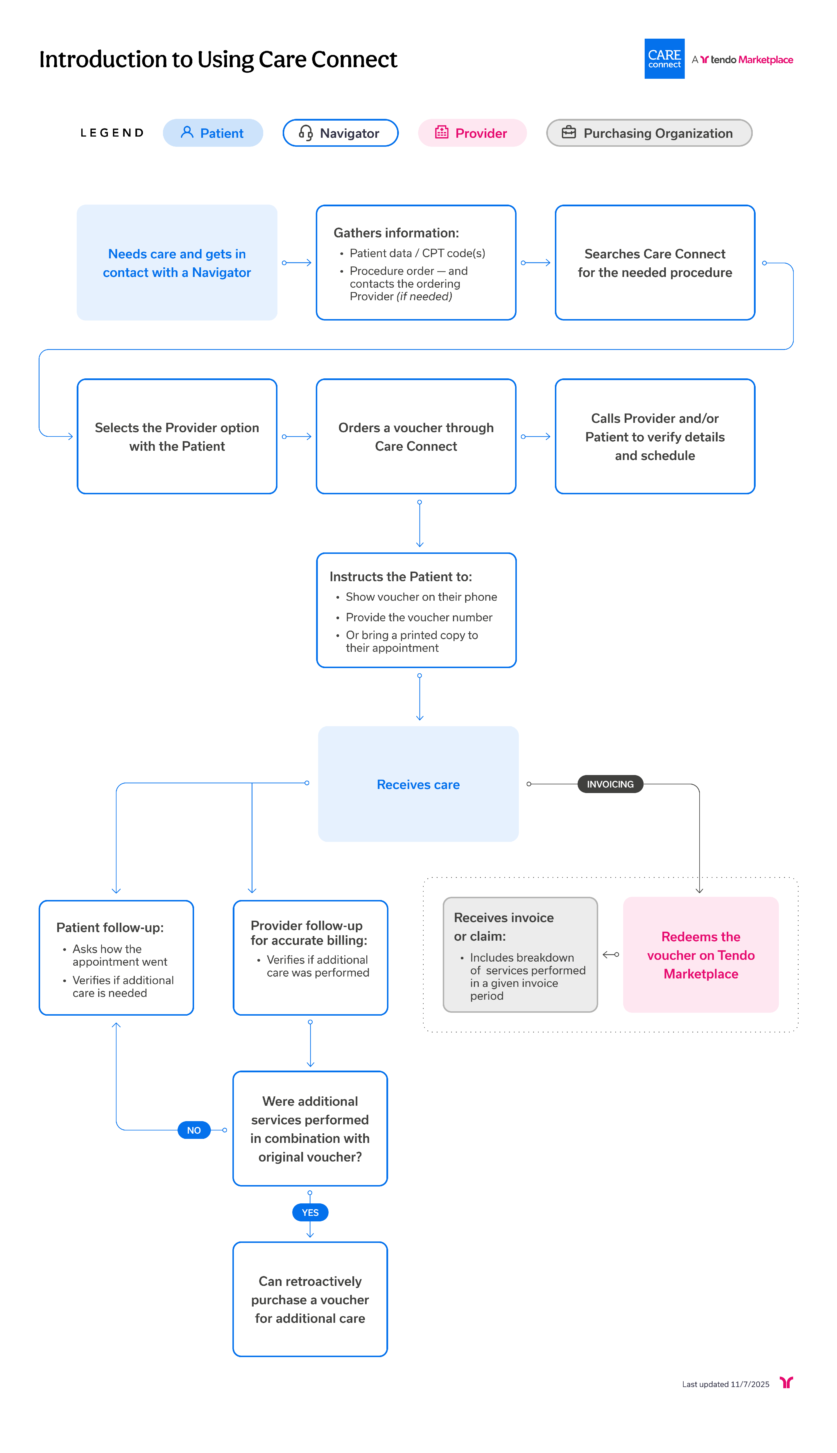 This is the generic flow for you as a care navigator to use Care Connect. Specific Care Connect workflows may vary somewhat.