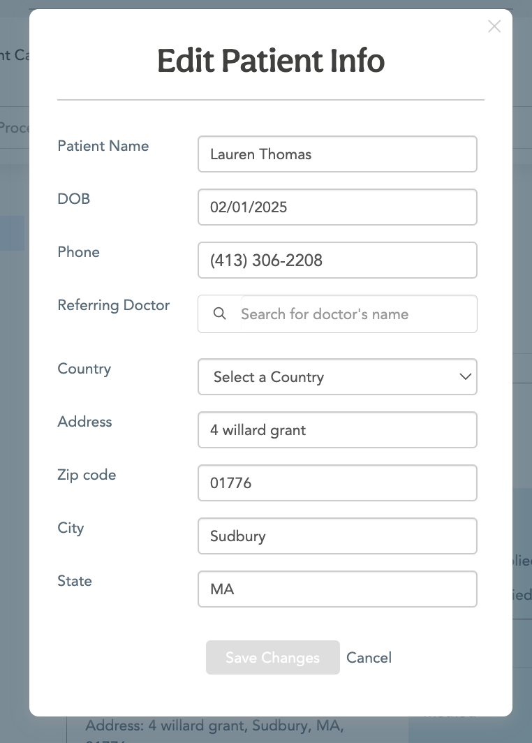 The second section on the left on the voucher page includes Patient information. To edit this information, click Edit Patient Info. A popup window displays on which you can make changes.