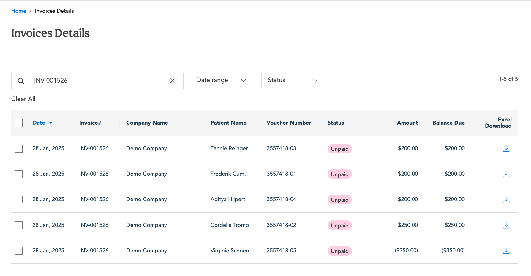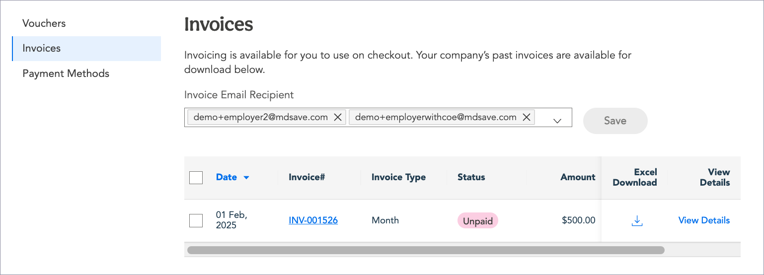 You can download an Excel version of the invoice that includes additional details about the transaction by clicking on the download icon in the Excel Download column on the Invoices page and opening the Excel file in your download folder.