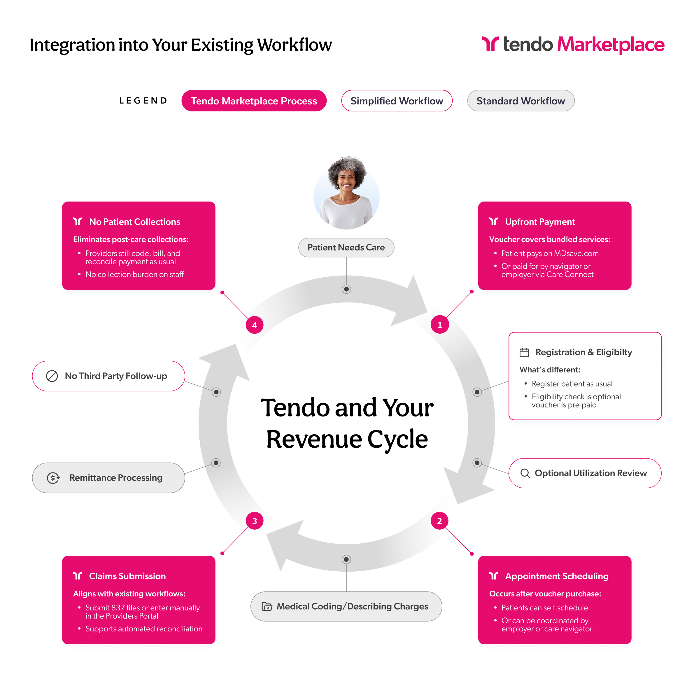 The healthcare revenue cycle refers to the process of managing a patient’s journey through a medical episode, from scheduling/registration to final payment. Tendo Marketplace simplifies this process by collecting and guaranteeing payment upfront, while seamlessly integrating with your existing revenue cycle workflows. This ensures that patients move smoothly through your processes without creating additional on-off processes for your team.
