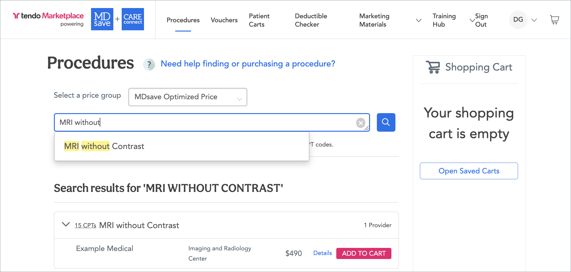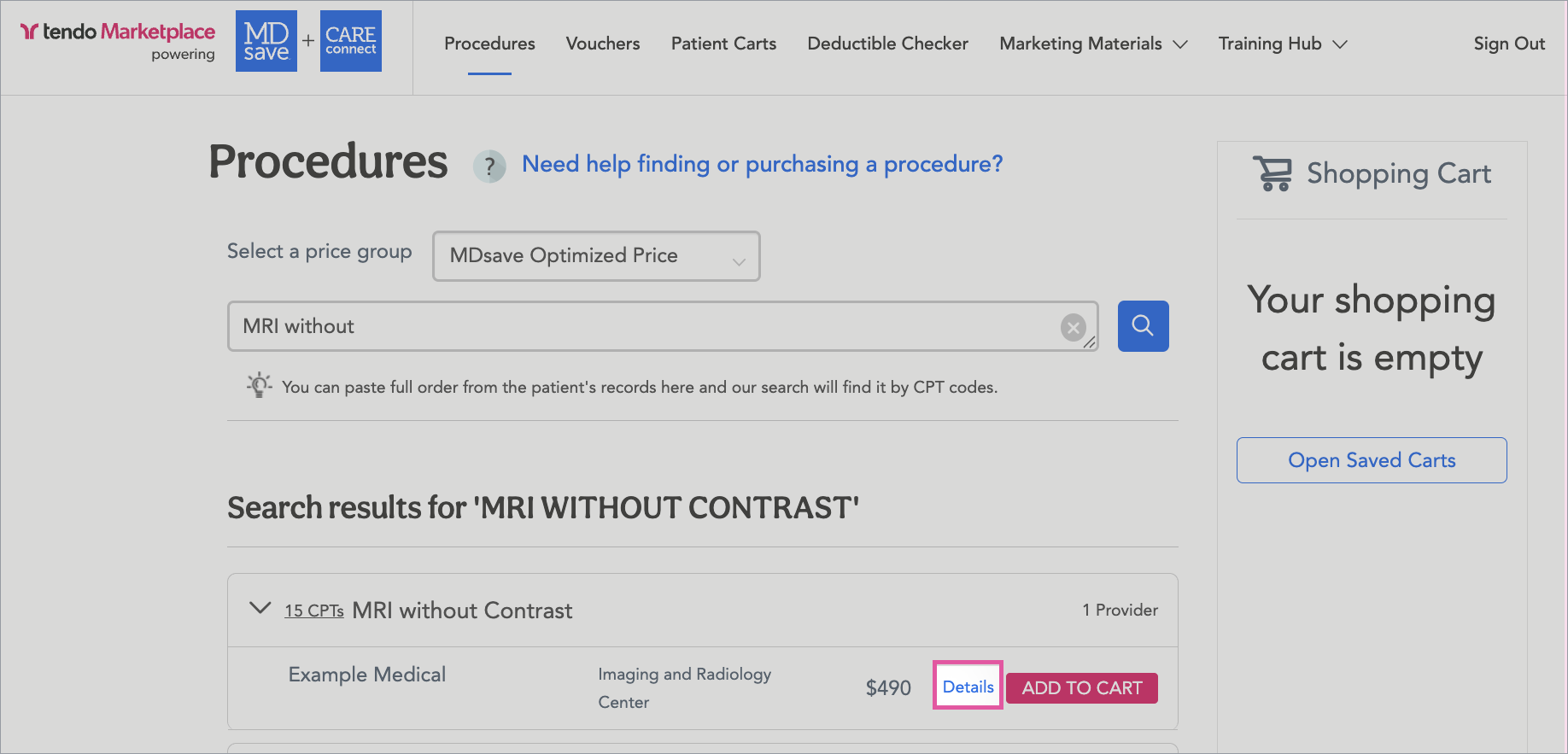 - Search for the procedure either using the CPT® Code (70336) or the procedure name (MRI without Contrast).