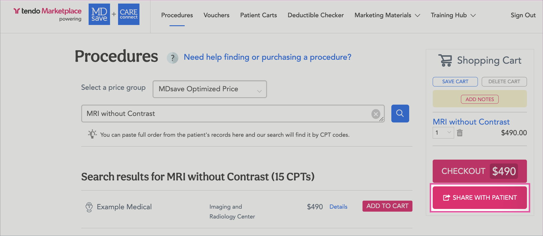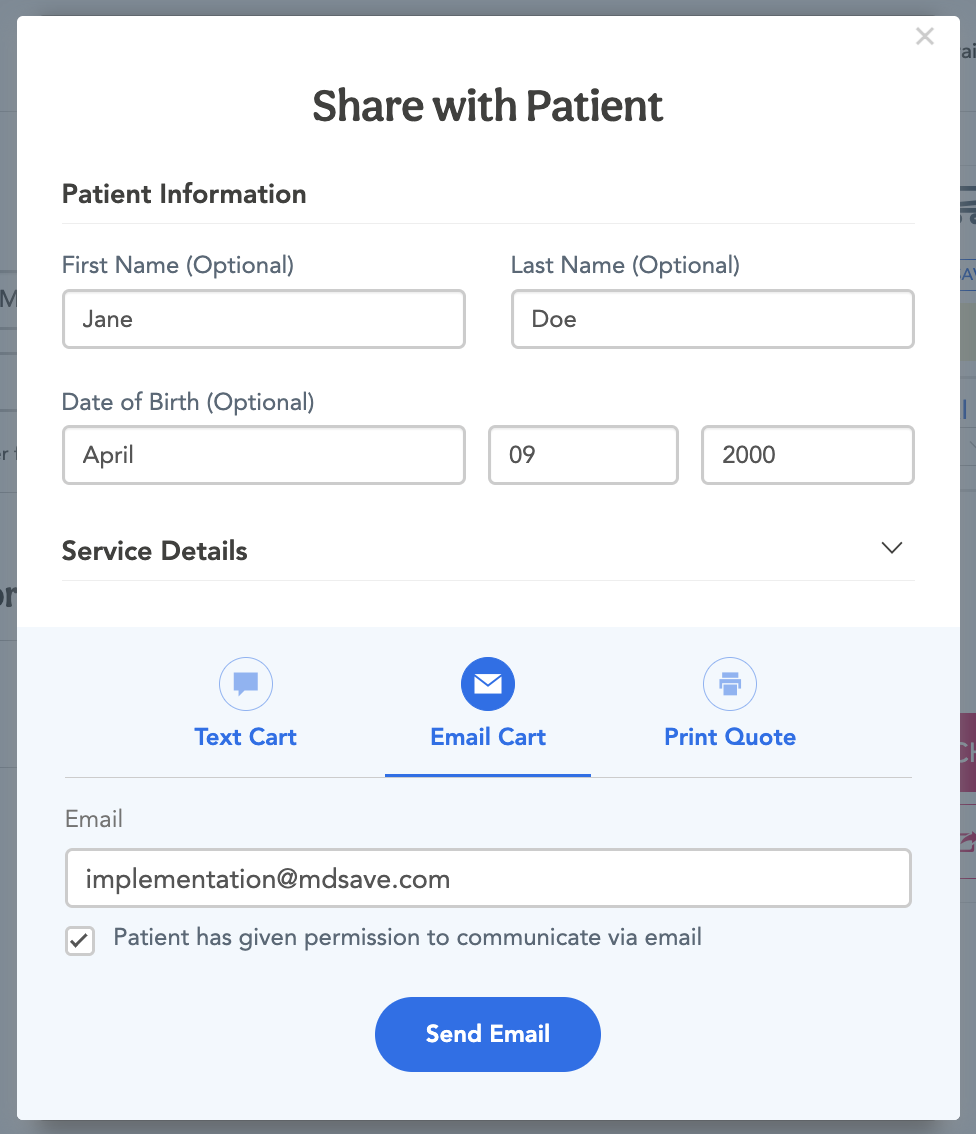 Sharing the cart will send a link to the patient’s shopping cart providing them with the price information and the ability to complete the purchase. The link can be sent via email or text, depending on their preferences.