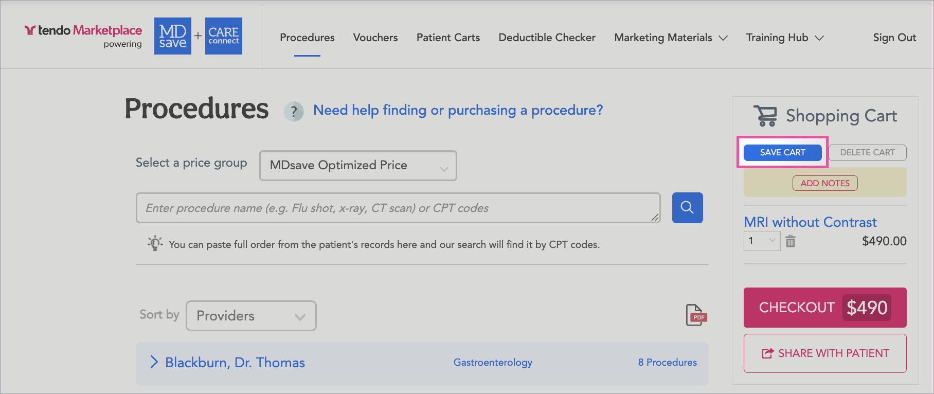 If you ever create a cart for a patient and need to save it to send to them later, click SAVE CART on the shopping cart’s upper left.