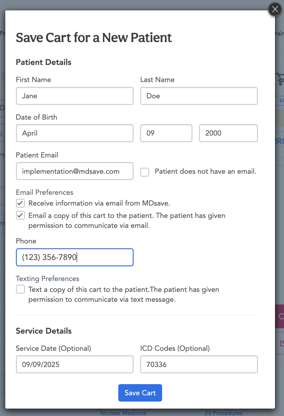 A Save Cart for a Patient popup will display with the option to either enter an existing patient’s name, email or account number, or if the patient is not in the system, Create a New Patient Profile. Click SAVE.