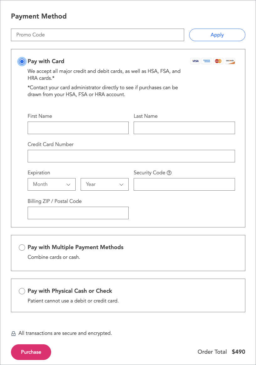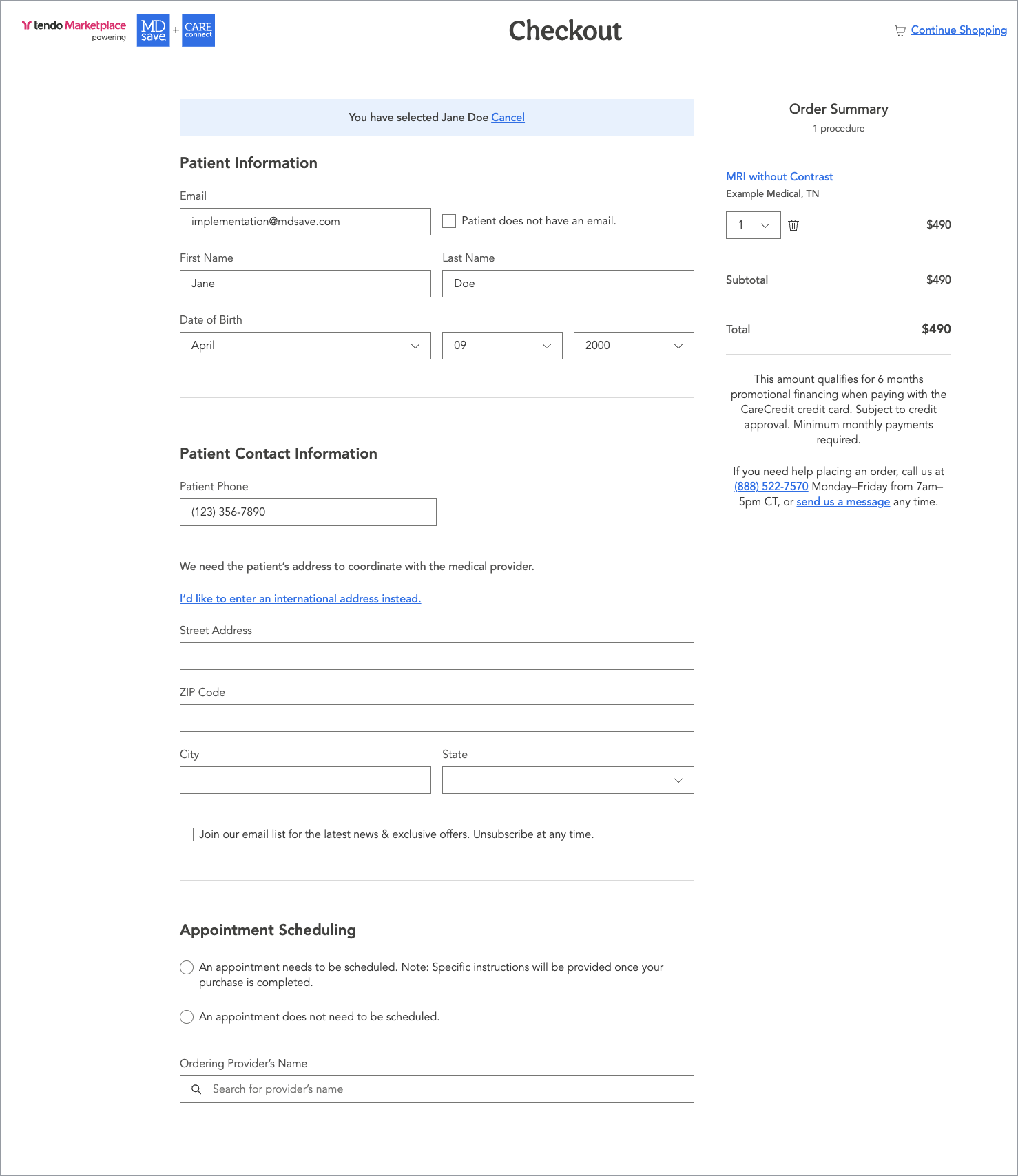 Both options will take you to the Checkout page, where you will enter patient, payment, and other information needed for checkout.