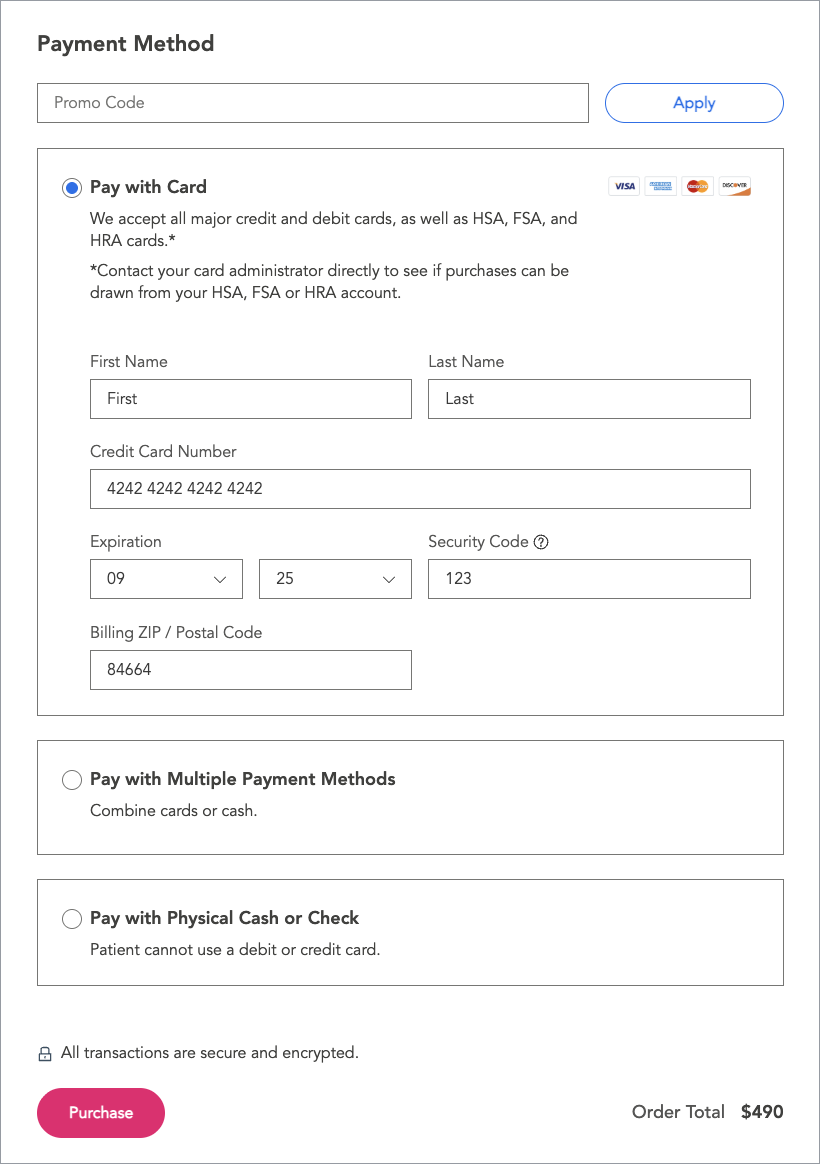 For this exercise, we’ll pay by credit card. Check Pay with Card to enter the patient’s credit card information under the Payment Method section.