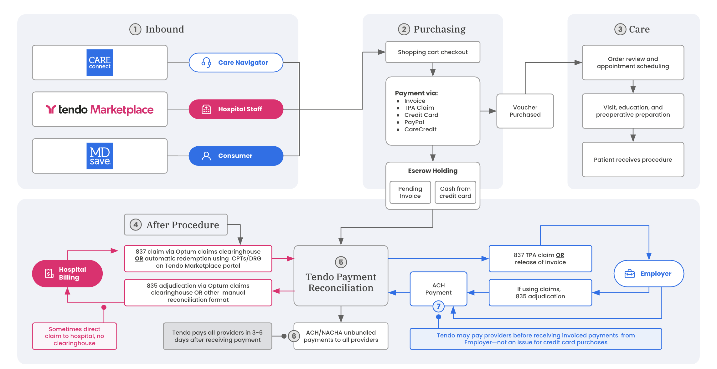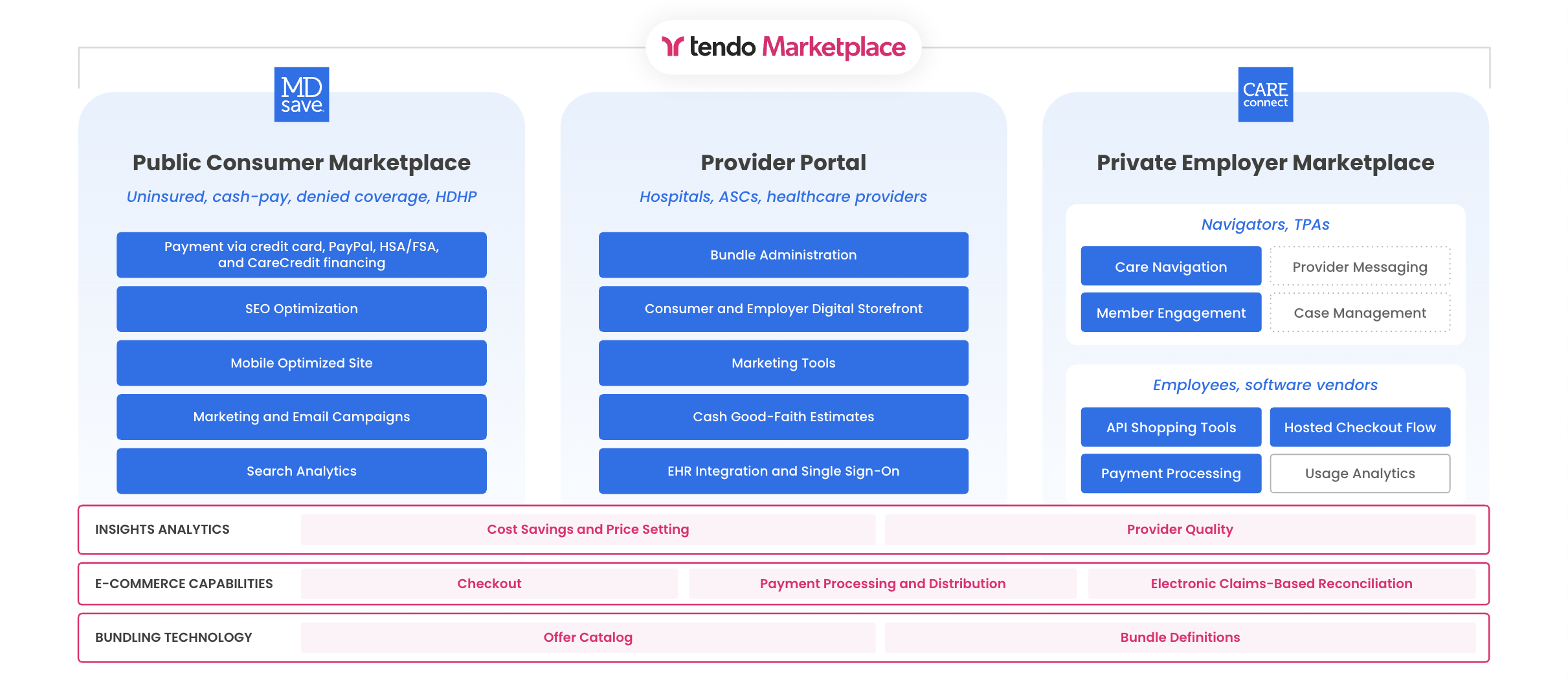 Tendo Marketplace serves public consumers who self-pay for procedure vouchers on the mdsave.com website, and private employers whose care navigators purchase vouchers as part of the employers' employee healthcare plans.