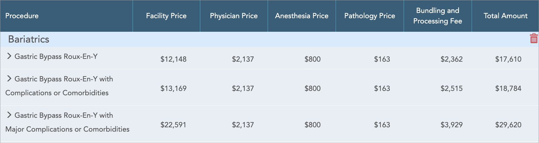 You will notice that the physician, anesthesia, and pathology price all remain the same for each of the different levels because the procedure being performed is the same procedure in the non-complicated procedure (Gastric Bypass Roux-En-Y). The facility increase in cost will make up for the extra care that is needed to take care of a patient with complications and/or comorbidities.