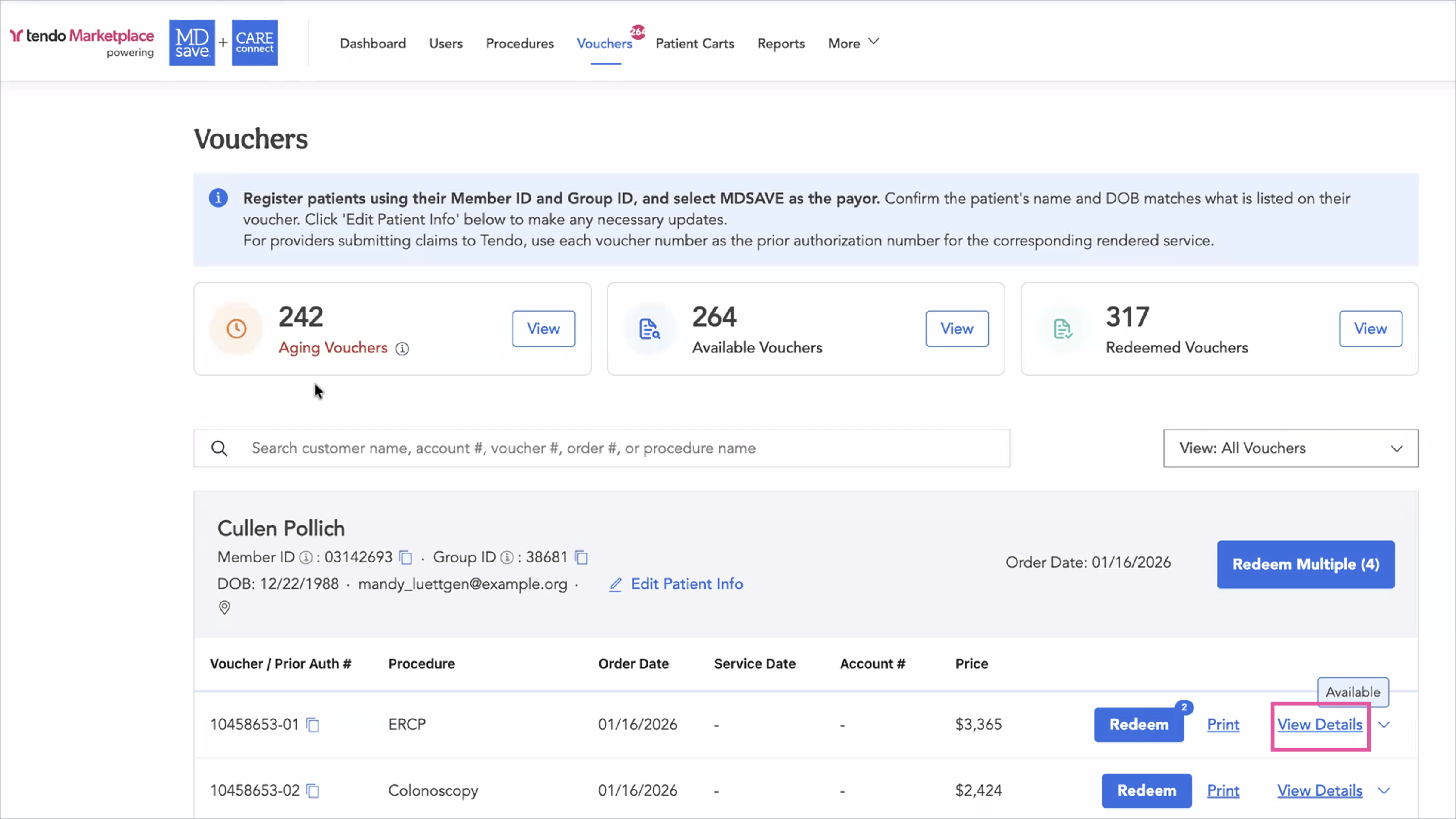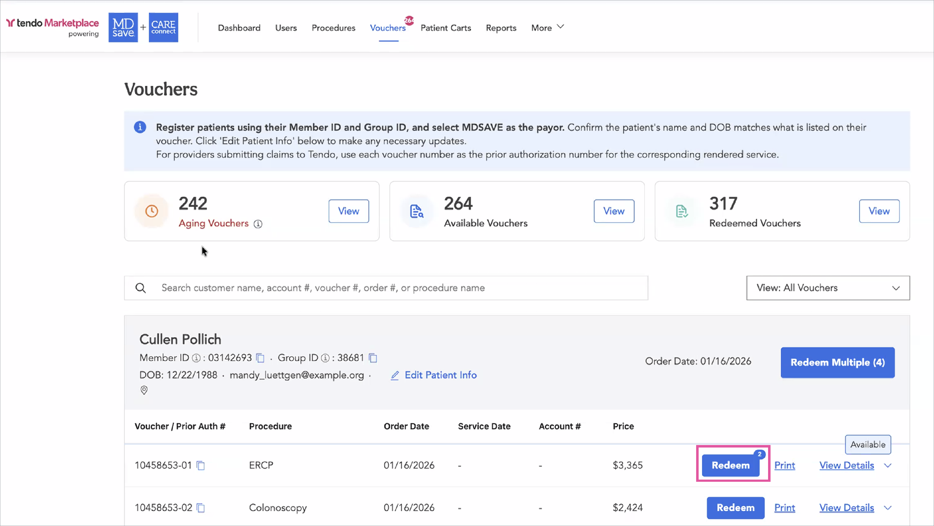 Redeem the voucher by clicking the REDEEM button on it or select multiple vouchers for the patient and click the REDEEM MULTIPLE button. This tells Tendo Marketplace to remit payment for the service. Payment is remitted to your facility only upon redemption of the voucher.