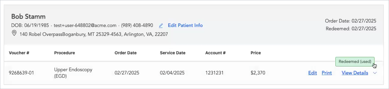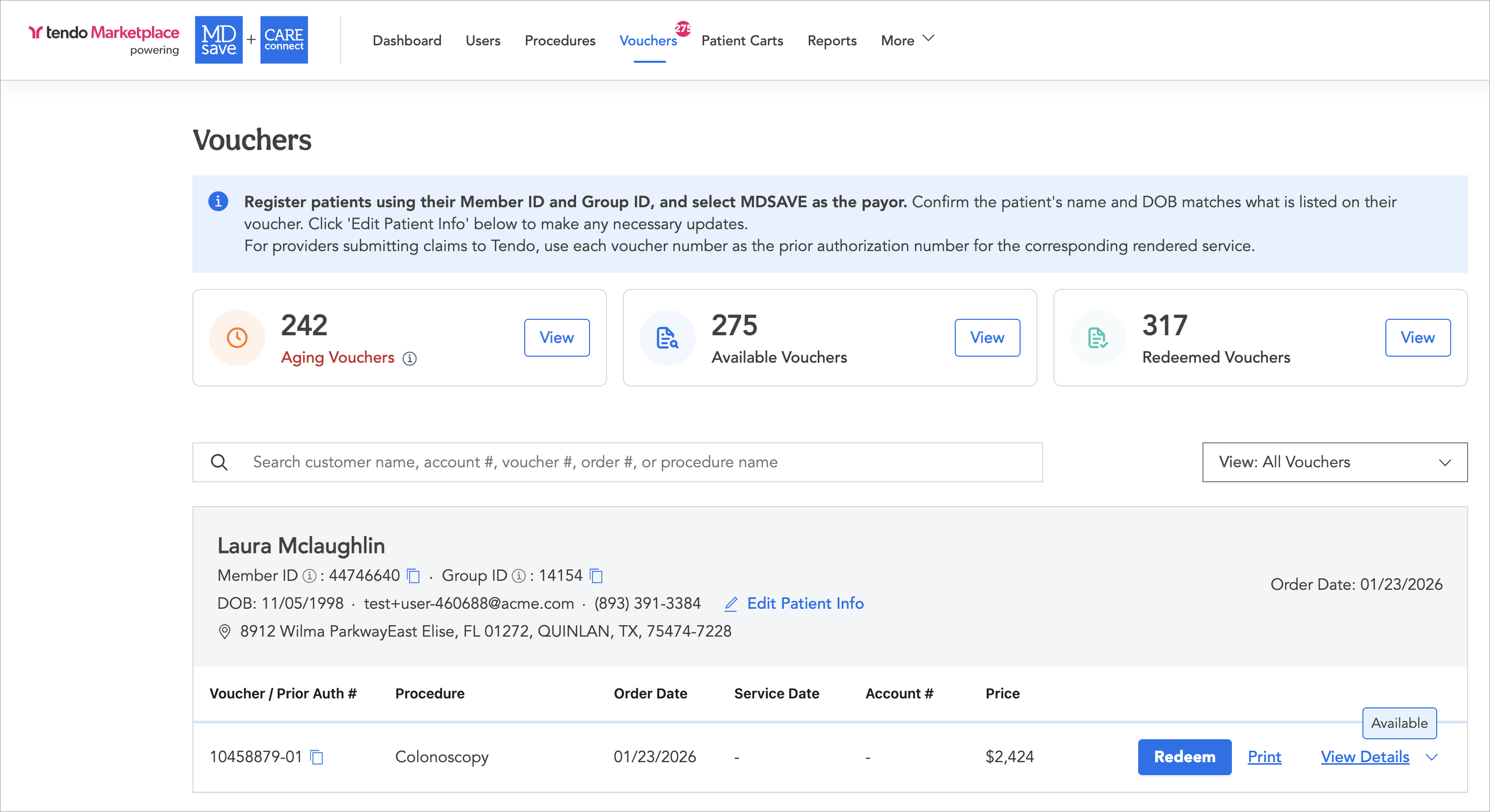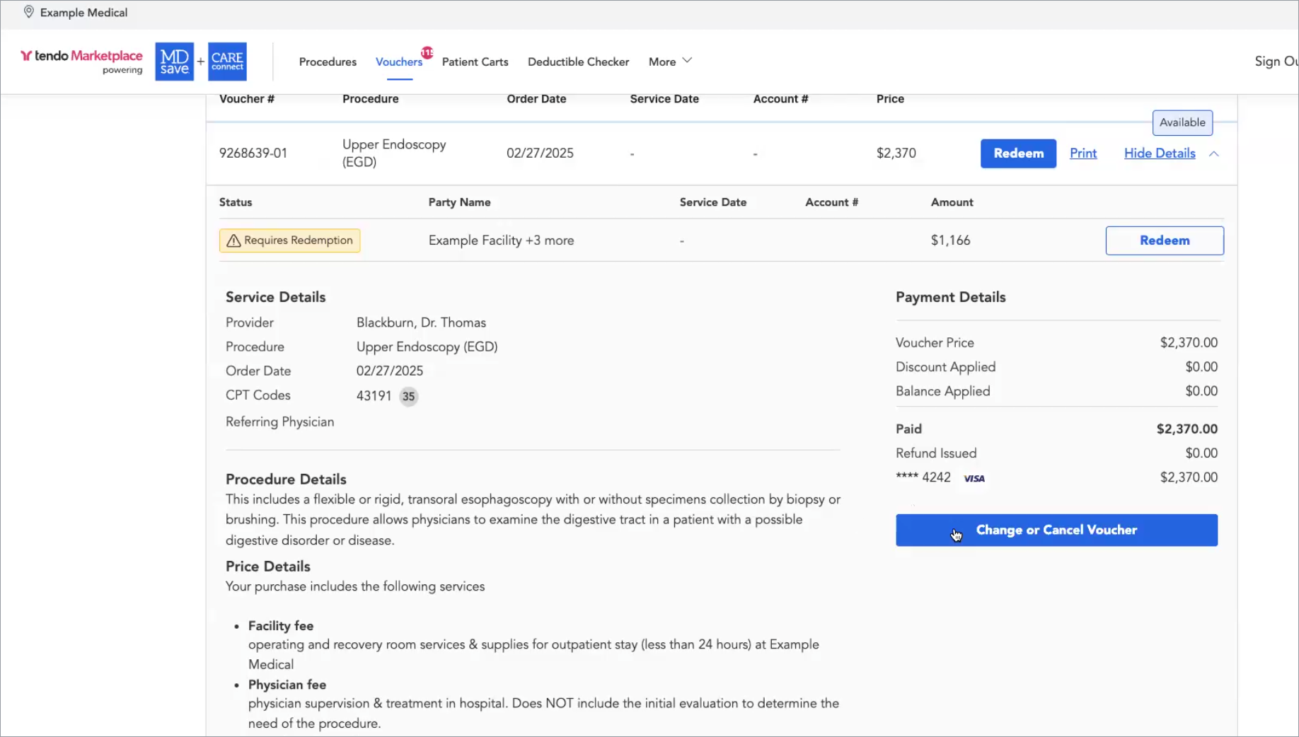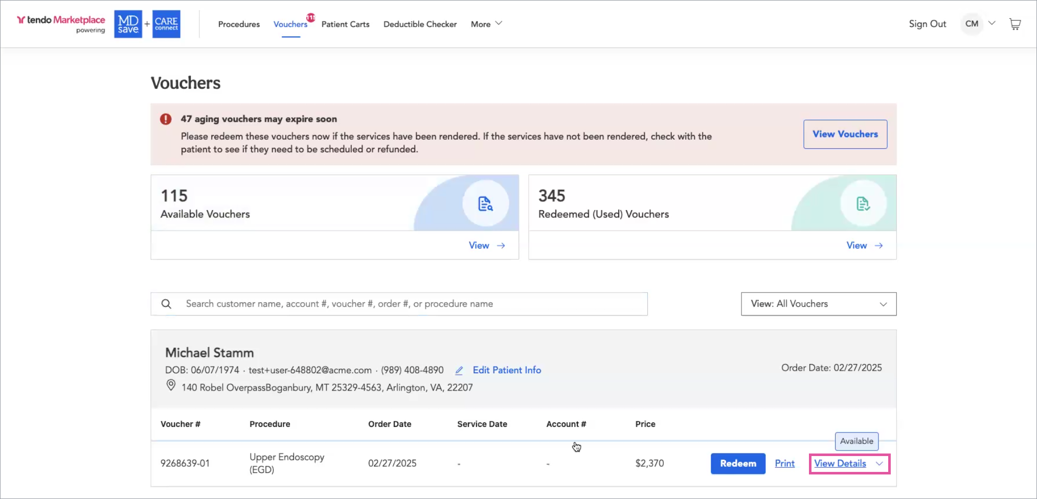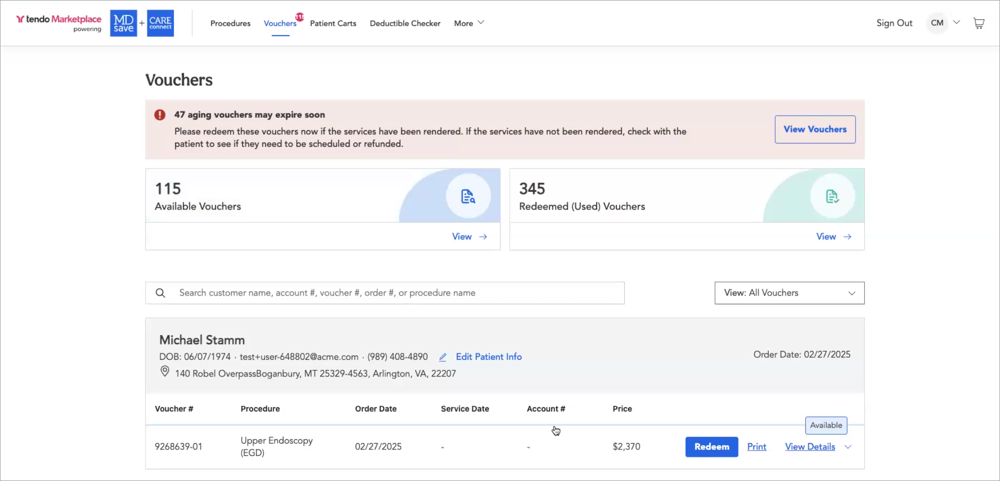 Under the Vouchers tab, you can search for vouchers by patient name or voucher number, which is why Tendo Marketplace recommends that patients bring the voucher or voucher number to their procedure appointment.