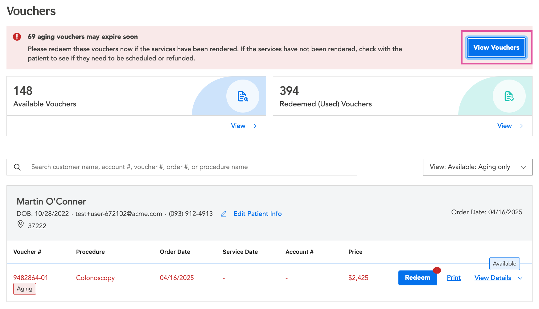 - Available: Aging Only - Vouchers that haven’t been redeemed and may expire soon. Most vouchers expire after 1 year. It’s important to double check aging vouchers to make sure that they were redeemed if the procedure was performed, or check with the patient if they purchased the procedure but didn’t schedule it. You also can see aging vouchers by checking View Vouchers in the pink box at the top that tells you how many aging vouchers may expire soon.