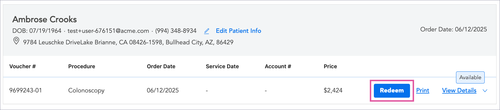 You also can redeem vouchers at other times. Click the Vouchers tab and search for the voucher. Click the blue Redeem button on the voucher row.