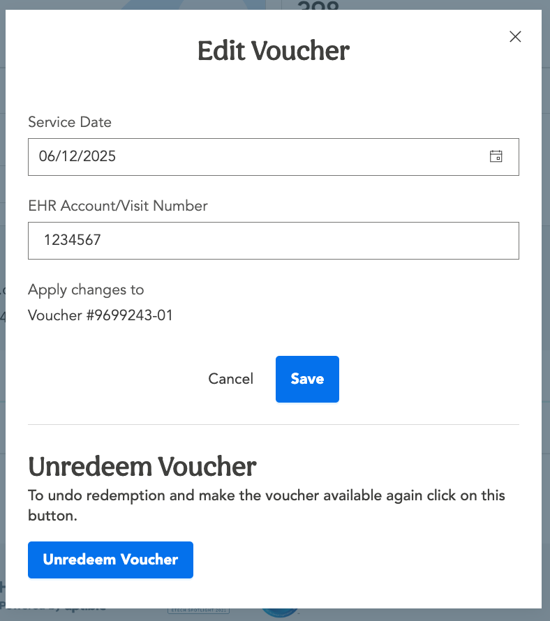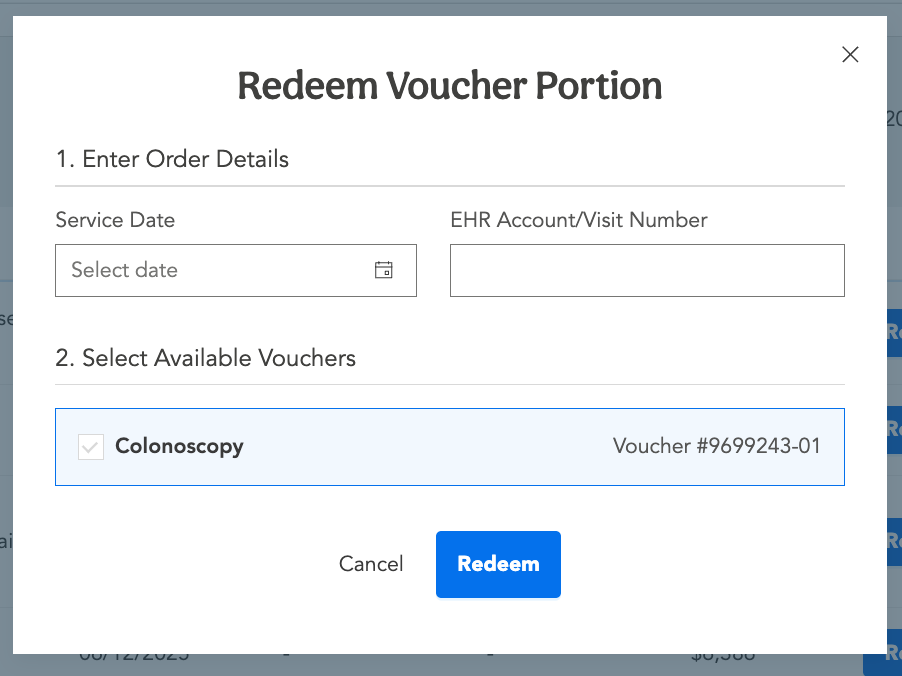 In both scenarios, a popup will display. Enter the Service Date (date of the procedure) and the EHR Account/Visit Number. You cannot redeem a voucher until the service date.