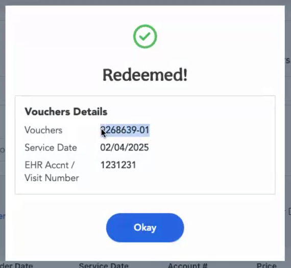 A popup will inform you that the voucher has been redeemed. Click Okay. Payment will be triggered and the associated providers will be paid for the procedure in the next payment cycle.