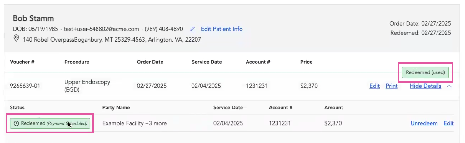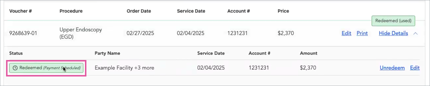 Click View Details, and you can see that the voucher has been redeemed and the payment scheduled.