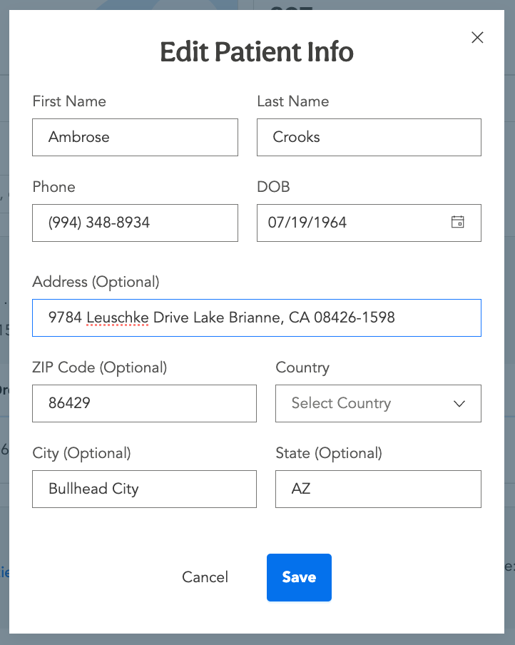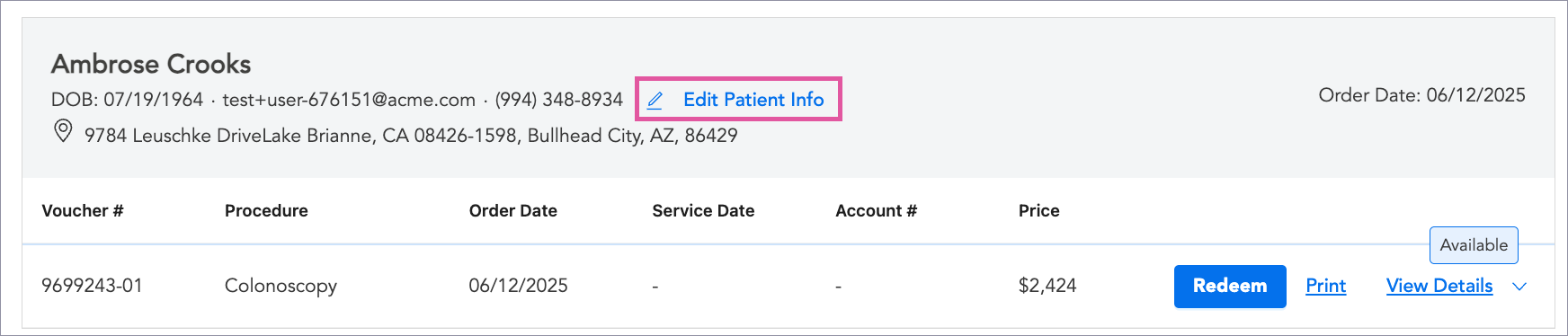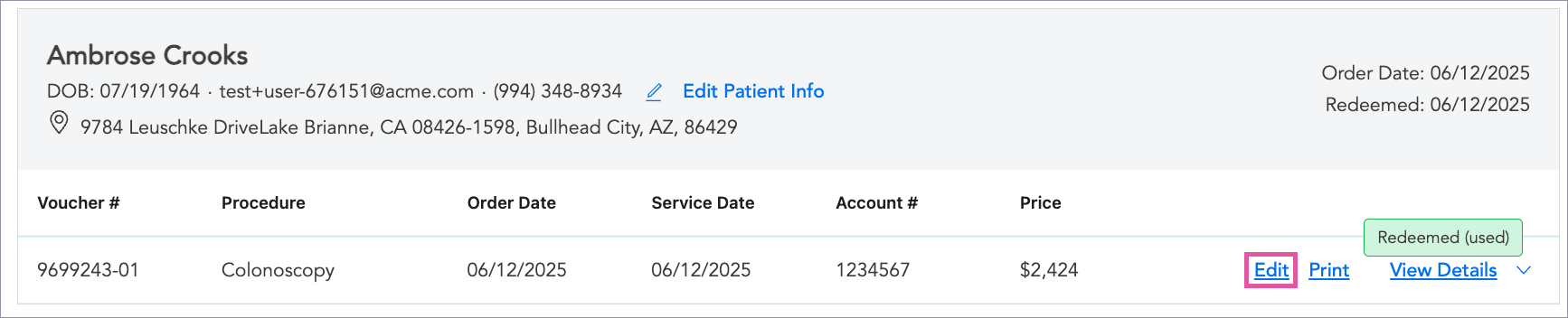 To edit the patient information on a voucher, find the voucher under the Vouchers tab and click Edit patient Info.