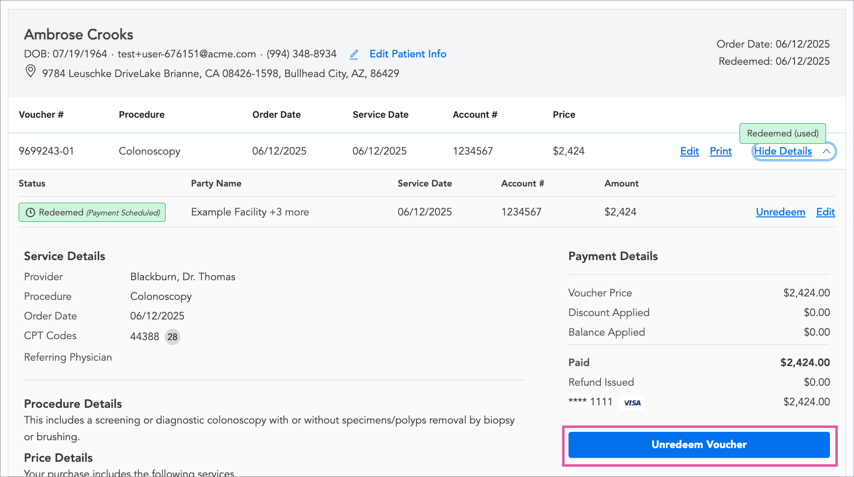 For example, a patient may arrive for a procedure and you redeem their voucher during registration. However, the patient then reveals that they have mistakenly eaten within 12 hours before the surgery as instructed so you need to reschedule them for a different date. You can unredeem the voucher as long as the payment hasn’t yet been paid out. Under the Vouchers tab, find the voucher, click View Details to expand it, and click Unredeem Voucher in the lower right corner.