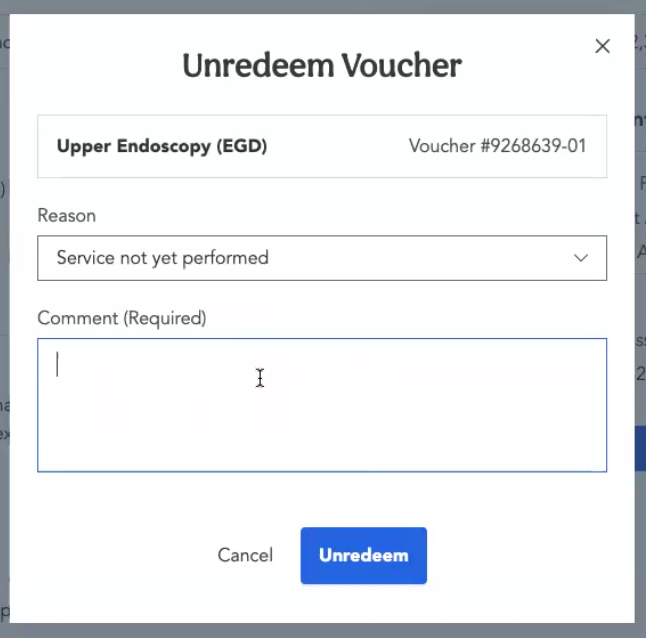 A popup will display on which you can select from a dropdown the reason the service was not yet performed, and add explanatory comments. Click Unredeem.