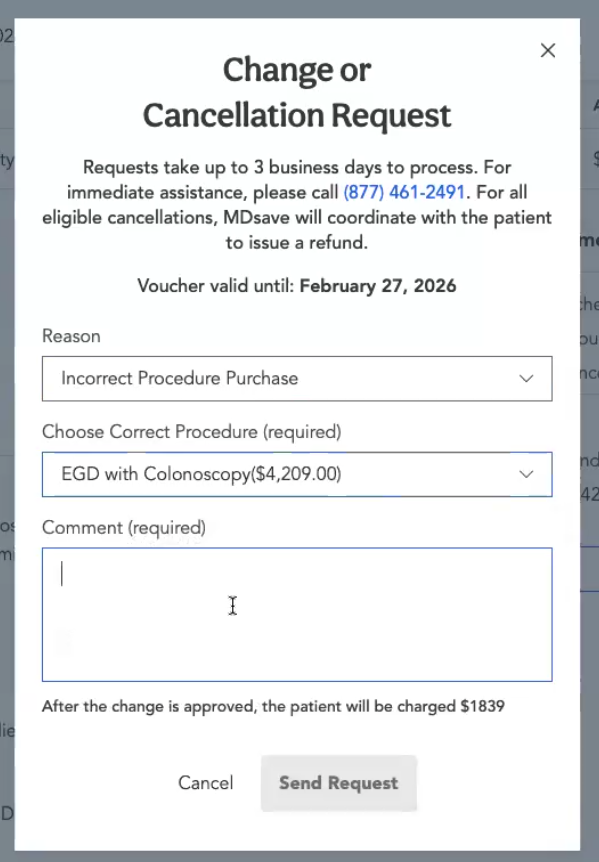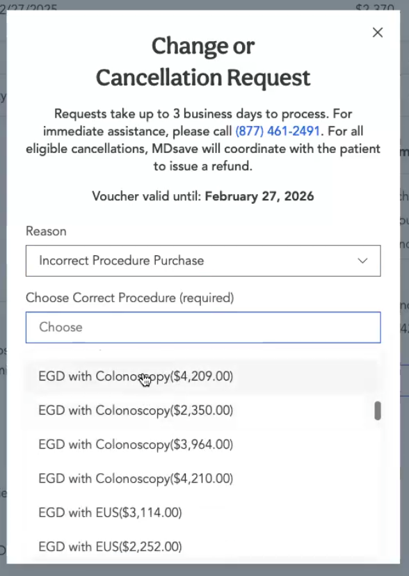 Our support team may reach out to the patient and provider to confirm that they should buy a different procedure. For example, a patient may have purchased an MRI without contrast online, because it’s less expensive than one with contrast. When they go in for their procedure, they are told that they need an MRI with and without contrast, which is another voucher. You will need to work with Tendo Marketplace Support to transfer the voucher to the correct one so that the patient will pay only the difference in cost between the two procedures. Tendo Support will cancel the old voucher and purchase the correct one for them.