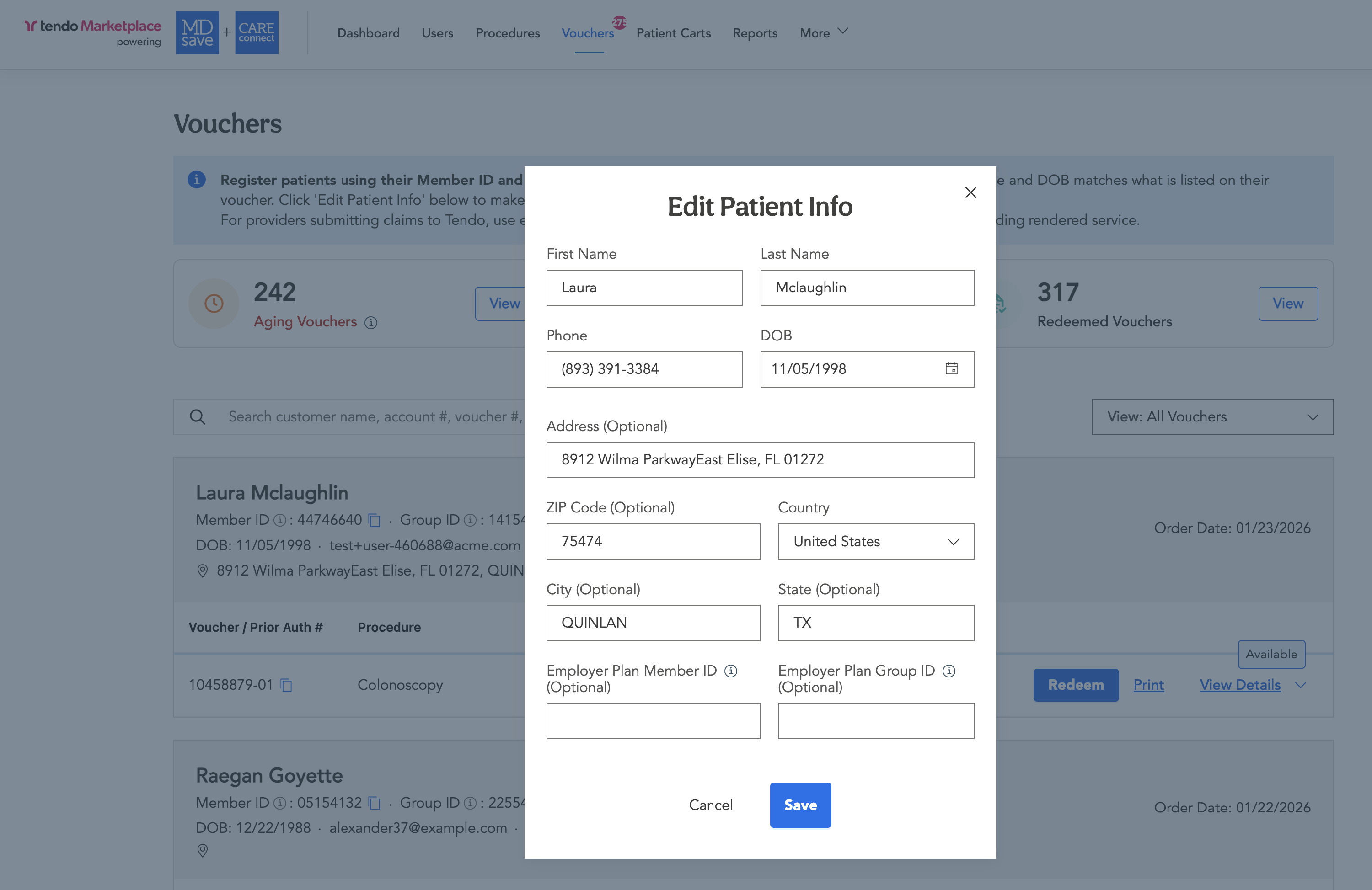 To Edit a patient's information on their voucher, click Edit Patient Info. A popup will appear on which you can make changes. Click Save.