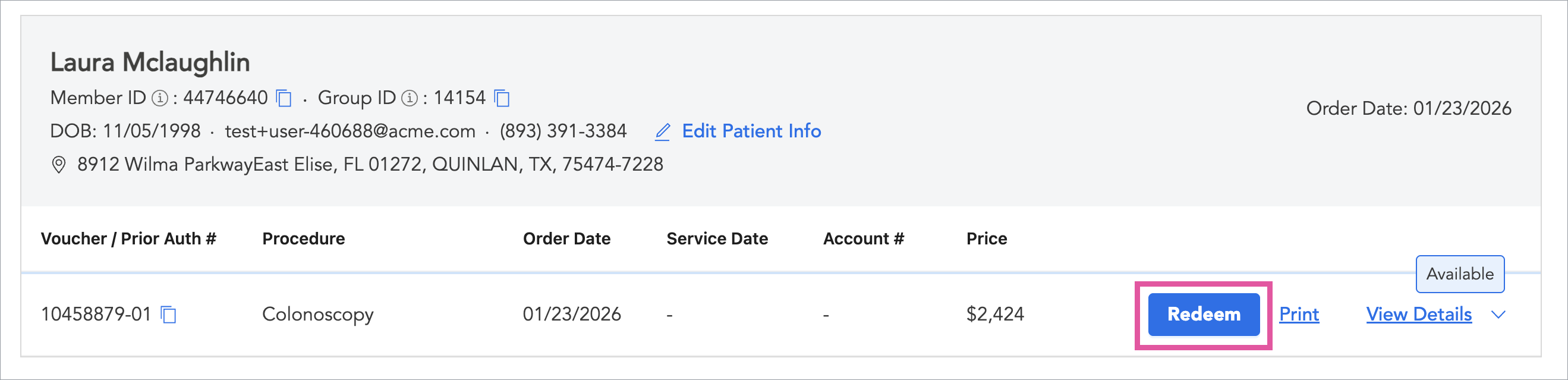 This will open a PDF version of the voucher which has a card on the left that contains all of the information needed to verify the voucher at the patient’s appointment., including the Member ID and Group ID. The Voucher/Prior Auth Number below the card on the left is used for prior authorization.