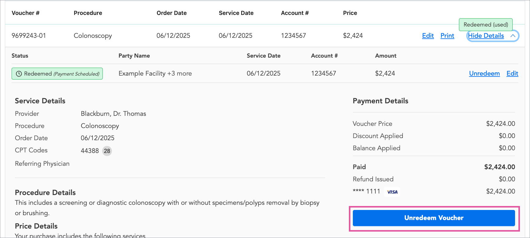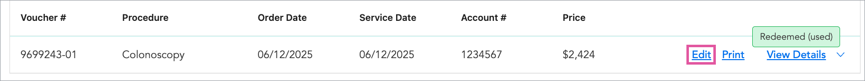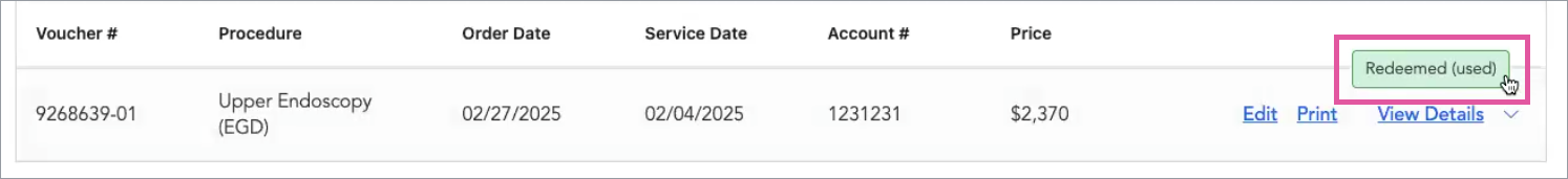 Click View Details on the right of a voucher’s row to expand it and see more information about the voucher, the procedure, and payment.
