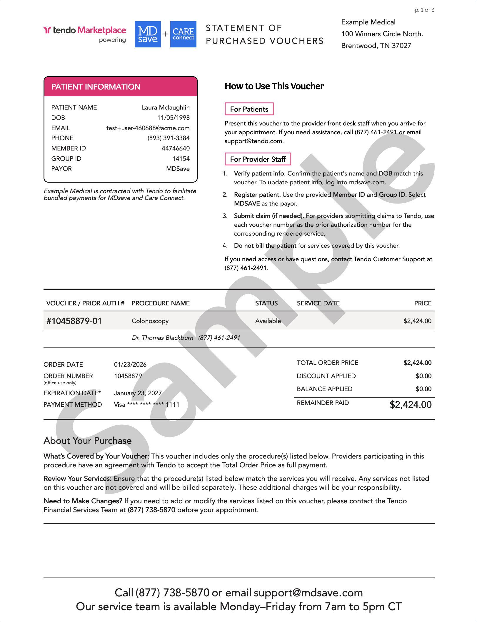 At the top in the blue box are instructions for you to register patients using their Member ID and Group ID, select MDSAVE as the payor, and confirm that the patient’s name and date of birth are on the voucher. If your facility submits claims to Tendo, use the voucher number as the prior authorization number.