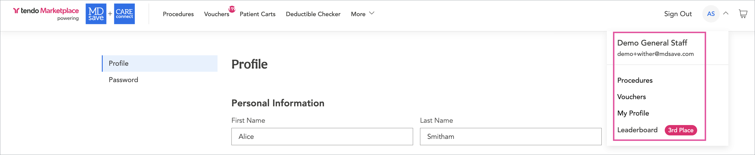 The first two items on the dropdown - Procedures and Vouchers - allow you to filter for Procedures and Vouchers. The third item, Profile, is where you can update your personal information.