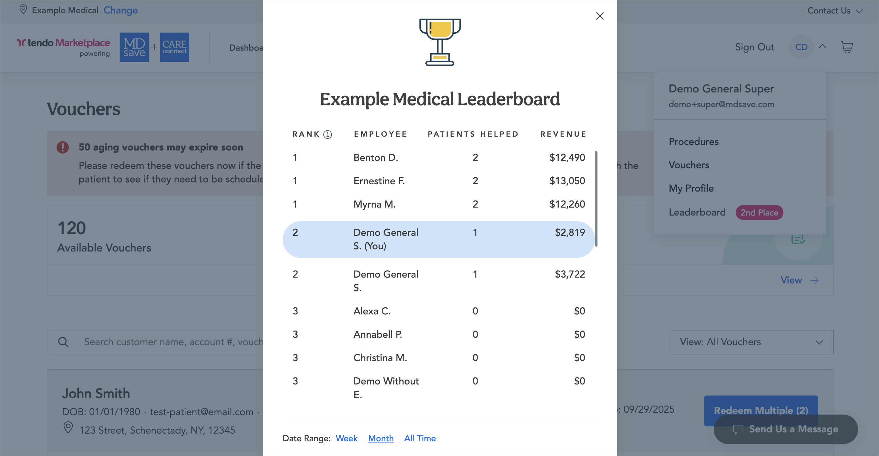 Click Leaderboard to see your rank and name, the number of patients you've helped purchase a voucher, and the revenue highlighted.