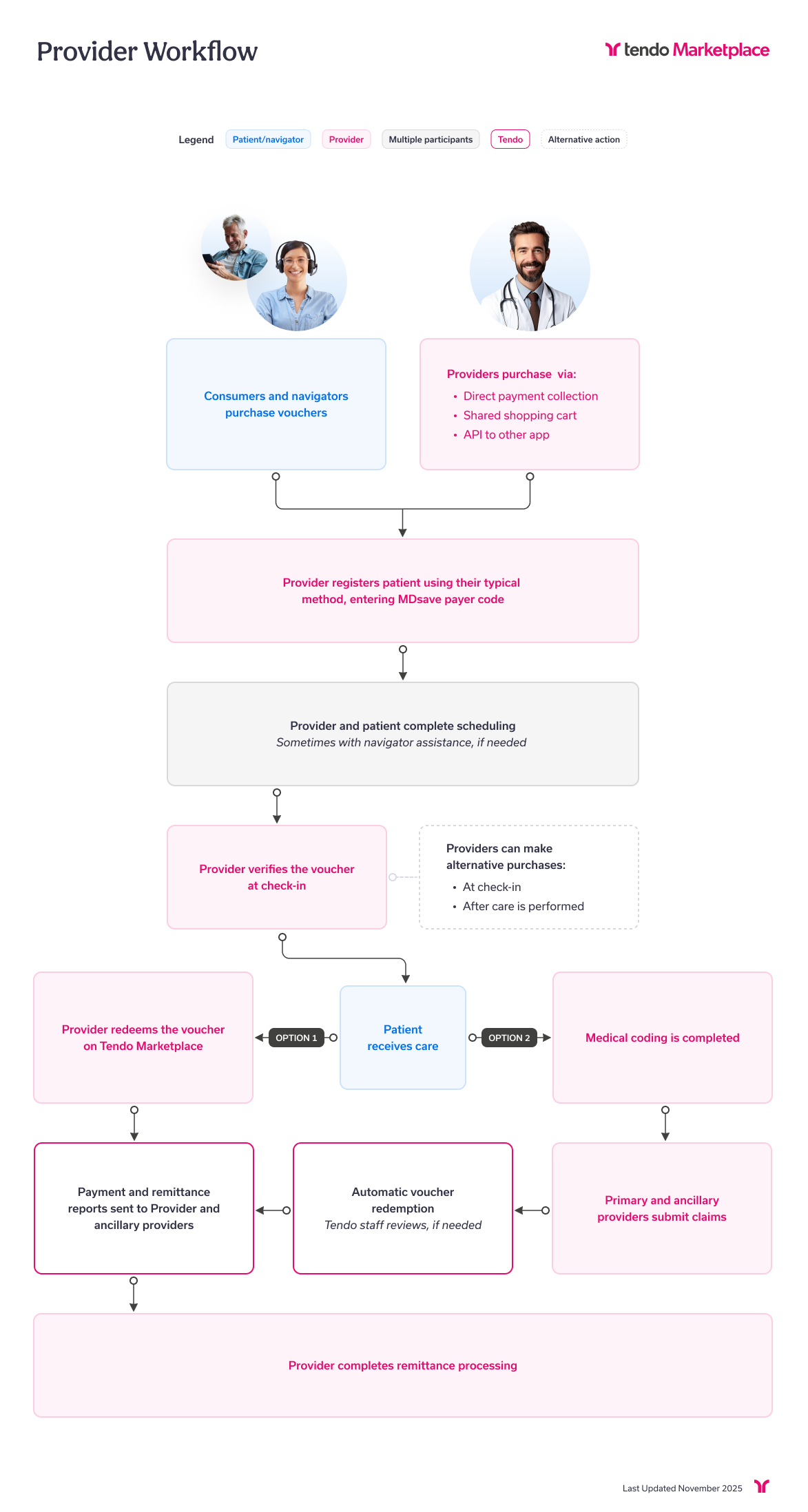 “Bring your voucher to your procedure appointment. You can show it to your provider’s staff on your phone, bring a printed copy, or provide your voucher number. Tendo Marketplace vouchers include both Care Connect and MDsave — they are the same voucher, and you can simply refer to your voucher as an MDsave voucher when presenting it to the staff.“