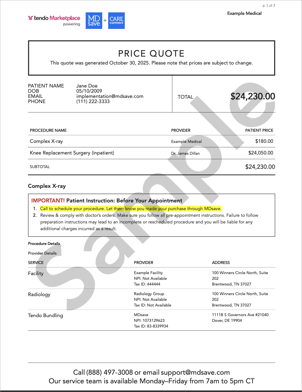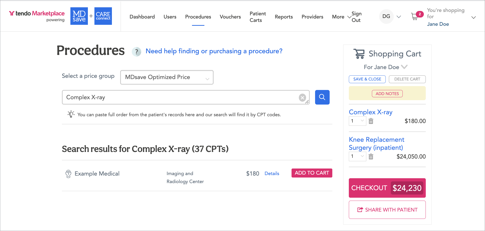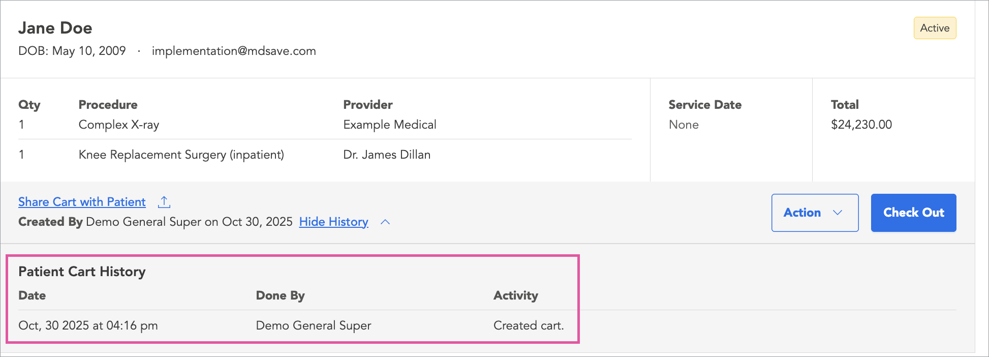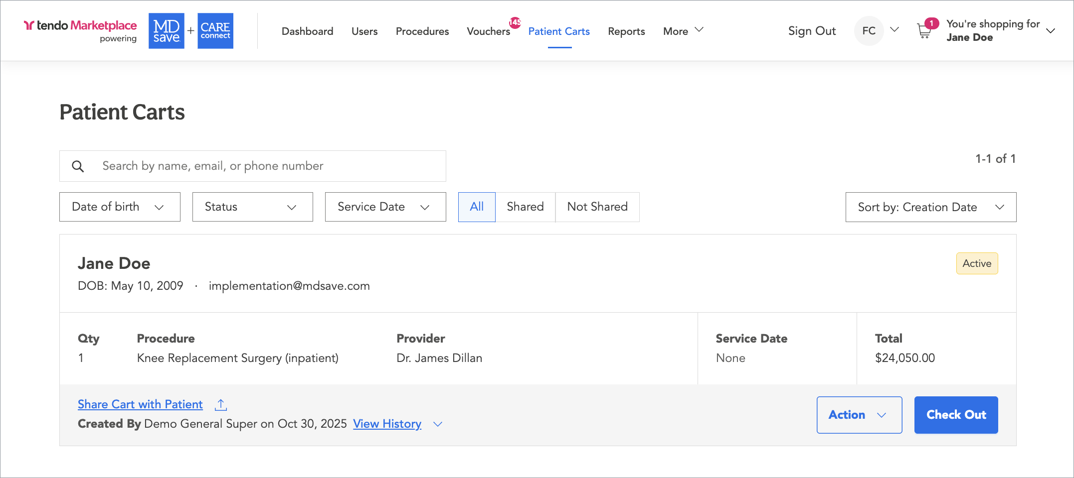 On a cart, you can see the patient’s name, date of birth, and email, the Procedure, Provider, Facility, Service Date, and total cost.