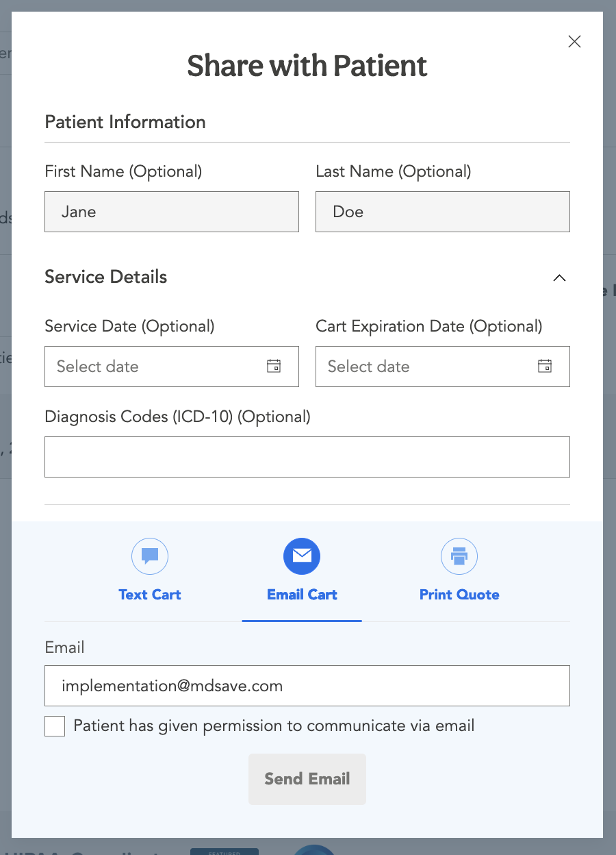 - Share - This brings up the Share with Patient form which you can use to share the cart with the patient. There also is a Share Cart with Patient link at the bottom of the cart that you can use.